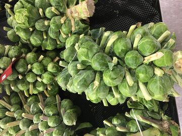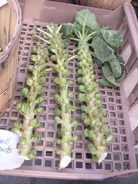 Brussels sprouts on stalks at a farmers' market in Massachusetts