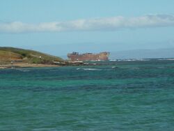 Shipwreck Beach on the north shore of the island is so named because of the remains of a wrecked vessel aground a short distance offshore. This is popularly referred to as a WW II Liberty Ship, although it is YOG-42, one of several concrete barges built during the war.[37]