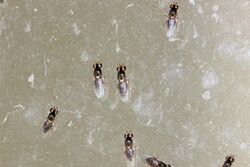 The Chloropidae are a family of flies commonly known as frit flies or grass flies.[1] About 2000 described species are in over 160 genera distributed worldwide. These are usually very small flies, yellow or black and appearing shiny due to the virtual absence of any hairs. The majority of the larvae are phytophagous, mainly on grasses, and can be major pests of cereals. However, parasitic and predatory species are known. A few species are kleptoparasites. Some species in the genera Hippelates and Siphunculina (S. funicola being quite well known in Asia) are called eye gnats or eye flies for their habit of being attracted to eyes. They feed on lachrymal secretions and other body fluids of various animals, including humans, and are of medical significance.[2][3]