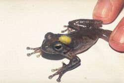 Though Chloropidae generally do not attack vertebrates directly, the larvae of the Australian frog flies, genus Batrachomyia, are exceptions. They cause myiasis in frogs. The parent fly, like most adult Chloropidae, feeds mainly on plant juices, but it lays its eggs near the frog. The larvae burrow under the skin of the body rather than the head or legs, and there they form visible swellings in which they lie as parasites, presumably feeding on blood and other bodily fluids. Most of the host frogs survive, but some do die.[5]