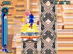 Each planet is split into seven parts: six main levels called acts and a boss level.[3] In each act, players must guide Sonic to the goal, whilst defeating enemies and dodging obstacles. In boss levels, players face one of Eggman's large robots, and must defeat it. Gameplay seamlessly shifts between side-scrolling and third-person perspectives.[3][5] Upon completion of a level, players are given a grade dependent on their performance, with an "S" being the best and a "D" being the worst.[6] As the player progresses through the game, more planets become available to select. Once each planet has been completed, a bonus seventh, which concludes the story, is unlocked.[7]