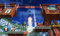 Sonic Colors features a co-operative two-player mode, Eggman's Sonic Simulator, in which players control Sonic-modeled robots or their Mii characters through a series of levels.[4] These levels can be unlocked by collecting special Red Star Rings hidden throughout each act.[3] Completing Sonic Simulator levels rewards the player Chaos Emeralds, and once all seven are collected, Sonic can transform into Super Sonic after collecting 50 rings in normal levels. As Super Sonic, players are invincible and can boost infinitely, though they cannot use Wisps and lose one ring per second, de-transforming when the ring counter hits zero.[7] The game also features online leaderboards, allowing players to upload their scores via Nintendo Wi-Fi Connection.[14]