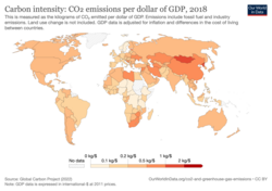 The following tables show carbon intensity of GDP in market exchange rates (MER) and purchasing power parities (PPP). Units are metric tons of carbon dioxide per thousand year 2005 US dollars. Data are taken from the US Energy Information Administration.[12] Annual data between 1980 and 2009 are averaged over three decades: 1980–89, 1990–99, and 2000–09.