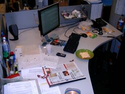 A desk or bureau is a piece of furniture with a flat table-style work surface used in a school, office, home or the like for academic, professional or domestic activities such as reading, writing, or using equipment such as a computer.[1][2] Desks often have one or more drawers, compartments, or pigeonholes to store items such as office supplies and papers.[2] Desks are usually made of wood or metal, although materials such as glass are sometimes seen.