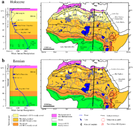 Vegetation and water bodies in northern and central Africa in the Eemian (bottom) and Holocene (top)