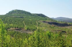 The Satah Mountain volcanic field is a linear region of cones and domes extending 50 km (31 mi) south from the Itcha Range to just north of Chantslar Lake. Volcanism along the entire length of the volcanic field 2.5 to 1.4 million years ago was characterized by the eruption of generally small volumes of magma that erupted at various times and at various locations. The eruption rates were high enough to build a north–south trending ridge upon which most of the volcanoes are located. This elongated feature, known as Satah Ridge, rises above the surrounding plateau surface with an average topographic prominence of 200 m (660 ft). The alignment of the Satah Mountain volcanic field corresponds with the orientation of two sets of normal faults in the Itcha Range, suggesting that volcanism there may have been controlled by a fault system. More than 20 volcanoes have been identified throughout the Satah Mountain volcanic field, with Satah Mountain and Mount Punkutlaenkut being the largest.[1] Smaller centres include Jorgensen Hill, Sugarloaf Mountain, Turbo Lake, White Creek and Holte Creek.[1][11]