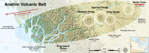 This west–east trending volcanic belt is about 330 km (210 mi) long, extending from the Central Coast through the Coast Mountains to near the community of Nazko on the Interior Plateau.[1][2][3][4] Its orientation is unique among the Neogene–Quaternary volcanic provinces of British Columbia in that it is perpendicular to the major geomorphological, structural and tectonic elements of the Canadian Cordillera.[1] Three segments comprise the AVB: the western segment, which has been reduced to remnants of eruptive breccia, high-level plutons and dike swarms; the central segment, which consists of predominantly shield volcanoes; and the eastern segment, which consists of several small cinder cones and is the location of all modern volcanic activity.[1][5][6]