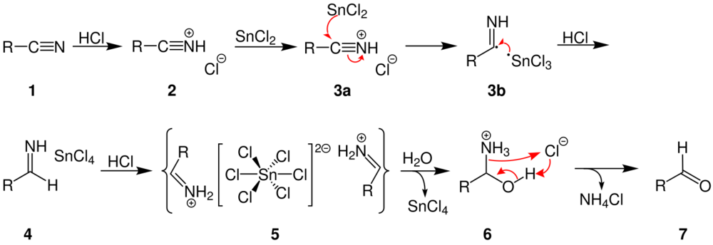 By addition of hydrogen chloride the used nitrile (1) reacts to its corresponding salt (2). It is believed that this salt is reduced by a single electron transfer by the tin(II) chloride (3a and 3b).[3] The resulting salt (4) precipitates after some time as aldimine tin chloride (5). Hydrolysis of 5 produces a hemiaminal (6) from which an aldehyde (7) is formed.