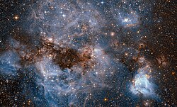 The Large Magellanic Cloud, a satellite galaxy of the Milky Way at about 50 kpc (160 thousand light years), contains a giant H II region called the Tarantula Nebula. Measuring at about 200 pc (650 light years) across, this nebula is the most massive and the second-largest H II region in the Local Group.[36] It is much bigger than the Orion Nebula, and is forming thousands of stars, some with masses of over 100 times that of the sun—OB and Wolf-Rayet stars. If the Tarantula Nebula were as close to Earth as the Orion Nebula, it would shine about as brightly as the full moon in the night sky. The supernova SN 1987A occurred in the outskirts of the Tarantula Nebula.[32]