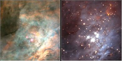 During the 20th century, observations showed that H II regions often contained hot, bright stars.[12] These stars are many times more massive than the Sun, and are the shortest-lived stars, with total lifetimes of only a few million years (compared to stars like the Sun, which live for several billion years). Therefore, it was surmised that H II regions must be regions in which new stars were forming.[12] Over a period of several million years, a cluster of stars will form in an H II region, before radiation pressure from the hot young stars causes the nebula to disperse.[13]