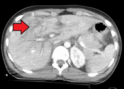A liver injury, also known as liver laceration, is some form of trauma sustained to the liver. This can occur through either a blunt force such as a car accident, or a penetrating foreign object such as a knife.[1] Liver injuries constitute 5% of all traumas, making it the most common abdominal injury.[2] Generally nonoperative management and observation is all that is required for a full recovery.