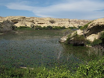 Oases develop in “hydrologically favored” locations that have attributes such as a high water table, seasonal lakes, or blockaded wadis.[3] Oases are made when sources of freshwater, such as underground rivers or aquifers, irrigate the surface naturally or via man-made wells.[4] The presence of water on the surface or underground is necessary and the local or regional management of this essential resource is strategic, but not sufficient to create such areas: continuous human work and know-how (a technical and social culture) are essential to maintain such ecosystems.[5][6] Some of the possible human contributions to maintaining an oasis include digging and maintaining wells, digging and maintaining canals, and continuously removing opportunistic plants that threaten to gorge themselves on water and fertility needed to maintain human and animal food supplies.[7] Stereotypically, an oasis has a “central pool of open water surrounded by a ring of water-dependent shrubs and trees…which are in turn encircled by an outlying transition zone to desert plants.”[8]