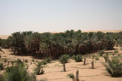 People who live in an oasis must manage land and water use carefully. The most important plant in an oasis is the date palm (Phoenix dactylifera L.), which forms the upper layer. These palm trees provide shade for smaller understory trees like apricots, dates, figs, olives, and peach trees, which form the middle layer. Market-garden vegetables, some cereals (such as sorghum, barley, millet, and wheat), and/or mixed animal fodder, are grown in the bottom layer where there is more moisture.[16] The oasis is integrated into its desert environment through an often close association with nomadic transhumant livestock farming (very often pastoral and sedentary populations are clearly distinguished). The fertility of the oasis soil is restored by “cyclic organic inputs of animal origin.”[14] In summary, an oasis palm grove is a highly anthropized and irrigated area that supports a traditionally intensive and polyculture-based agriculture.[1]