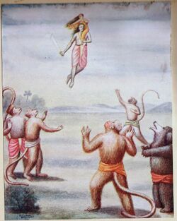 Although the word Vanara has come to mean "monkey" over the years and the Vanaras are depicted as monkeys in the popular art, their exact identity is not clear.[7][8] According to the Ramayana, Vanaras were shapeshifters. In the Vanara form, they had beards with extended sideburns, narrowly shaved chin gap, and no moustache. They had a tail and razor-sharp claws. Their skin and skeleton were inforced with an indestructible Vajra, which no earthly element could penetrate. Unlike other exotic creatures such as the rakshasas, the Vanaras do not have a precursor in the Vedic literature.[9] The Ramayana presents them as humans with reference to their speech, clothing, habitations, funerals, weddings, consecrations etc. It also describes their monkey-like characteristics such as their leaping, hair, fur and a tail.[8] Aiyanagar suggests that though the poet of the Ramayana may have known that vanaras were actually forest-dwelling people, he may portrayed them as real monkeys with supernatural powers and many of them as Script error: The function "transl" does not exist.s (portions) of the gods to make the epic more "fantastic".[3]