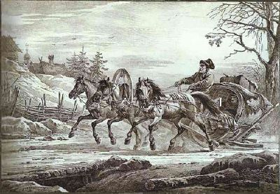 Traveling in a troika (three-horse sled).