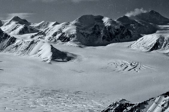 Aerial view looking west with Mt. Elusive centered, Mt. Edison upper left, and Mt. Gilbert Lewis in upper right