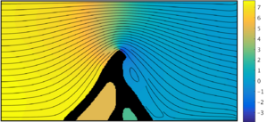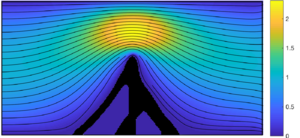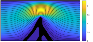 Fluid-structure-interaction is a strongly coupled phenomenon and concerns the interaction between a stationary or moving fluid and an elastic structure. Many engineering applications and natural phenomena are subject to fluid-structure-interaction and to take such effects into consideration is therefore critical in the design of many engineering applications. Topology optimisation for fluid structure interaction problems has been studied in e.g. references[11][12][13] and.[14] Design solutions solved for different Reynolds numbers are shown below. The design solutions depend on the fluid flow with indicate that the coupling between the fluid and the structure is resolved in the design problems.