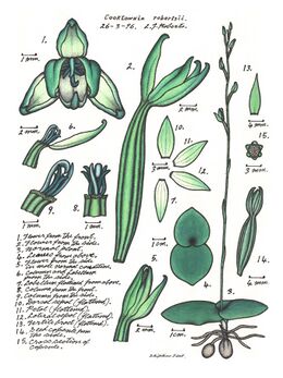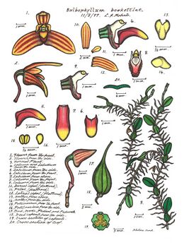 Following the conventions of botanical illustration, Lewis records his subjects comprehensively – plant, flower and fruit. He also dissects the flowers of each to show its various parts – petals, sepal, column, labellum, anther and pollinia.
