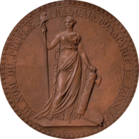 The imagery was introduced to Britain, partly by the Dutch William III of England, who in one medal presents a cap of liberty to the kneeling England, Scotland and Ireland.[8] When Britannia was pictured as "British Liberty", she usually exchanged the trident she normally carried for a liberty pole. An example of this is a large monument, originally called the "Column of British Liberty", now usually just the "Column to Liberty", begun in the 1750s on his Gibside estate outside Newcastle-on-Tyne by the hugely wealthy Sir George Bowes, reflecting his Whig politics. Set at the top of a steep hillock, the monument itself is taller than Nelson's Column in London, and topped by a bronze female figure, originally gilded, carrying a cap of liberty on a pole.[9]