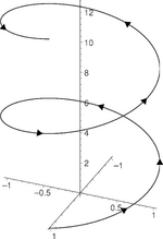 Helical symmetry is the kind of symmetry seen in everyday objects such as springs, Slinky toys, drill bits, and augers. The concept of helical symmetry can be visualized as the tracing in three-dimensional space that results from rotating an object at a constant angular speed, while simultaneously translating at a constant linear speed along its axis of rotation. At any point in time, these two motions combine to give a coiling angle that helps define the properties of the traced helix.[26] When the tracing object rotates quickly and translates slowly, the coiling angle will be close to 0°. Conversely, if the object rotates slowly and translates quickly, the coiling angle will approach 90°.