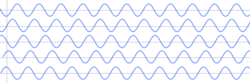 In a rigid lattice structure, atoms exert force on each other, maintaining equilibrium. Most of these atomic forces, such as covalent or ionic bonds, are of electric nature. The magnetic force, and the force of gravity are negligible.[16] Because of the bonding between them, the displacement of one or more atoms from their equilibrium positions gives rise to a set of vibration waves propagating through the lattice. One such wave is shown in the figure to the right. The amplitude of the wave is given by the displacements of the atoms from their equilibrium positions. The wavelength λ is marked.[17]
