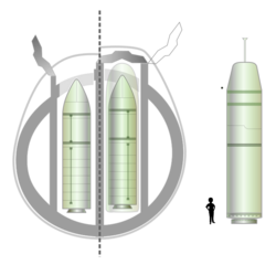 The world's first operational nuclear-powered ballistic missile submarine (SSBN) was USS George Washington (SSBN-598) with 16 Polaris A-1 missiles, which entered service in December 1959 and conducted the first SSBN deterrent patrol November 1960 – January 1961.[6] George Washington also conducted the first successful submerged SLBM launch with a Polaris A-1 on 20 July 1960.[7] Fifty-two days later, the Soviet Union made its first successful underwater launch of a submarine ballistic missile in the White Sea, on 10 September 1960 from the same converted Project 611 (NATO reporting name Zulu-IV class) submarine that first launched the R-11FM.[8] The Soviets were only a year behind the US with their first SSBN, the ill-fated K-19 of Project 658 (Hotel class), commissioned in November 1960. However, the Hotel class carried only three R-13 missiles (NATO reporting name SS-N-4) each and had to surface and raise the missile to launch.[9] Submerged launch was not an operational capability for the Soviets until 1963, when the R-21 missile (SS-N-5) was first backfitted to Project 658 (Hotel class) and Project 629 (Golf class) submarines.[10] The Soviet Union was able to beat the U.S. in launching and testing the first SLBM with a live nuclear warhead, an R-13 that detonated in the Novaya Zemlya Test Range in the Arctic Ocean, doing so on 20 October 1961,[11] just ten days before the gigantic 50 Mt Tsar Bomba's detonation in the same general area. The United States eventually conducted a similar test in the Pacific Ocean on 6 May 1962, with a Polaris A-2 launched from USS Ethan Allen (SSBN-608) as part of the nuclear test series Operation Dominic. The first Soviet SSBN with 16 missiles was the Project 667A (Yankee class), which first entered service in 1967 with 32 boats completed by 1974.[12][13] By the time the first Yankee was commissioned the US had built 41 SSBNs, nicknamed the "41 for Freedom".[14][15]