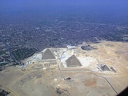 Giza Plateau has several remains from the 26th century BC such as temples and monuments to Egyptian Pharaohs including the Great Sphinx, and the Great Pyramids of Giza.[34] The Giza Plateau also includes Saqqara, the ancient burial ground which served as the necropolis for the Ancient Egyptian capital of Memphis. It features numerous pyramids, including the world's oldest standing step pyramid, as well as a number of mastabas.[35]