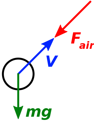 Air resistance creates a force that (for symmetric projectiles) is always directed against the direction of motion in the surrounding medium and has a magnitude that depends on the absolute speed: [math]\displaystyle{ \mathbf{F_{air}} = -f(v)\cdot\mathbf{\hat v} }[/math]. The speed-dependence of the friction force is linear ([math]\displaystyle{ f(v) \propto v }[/math]) at very low speeds (Stokes drag) and quadratic ([math]\displaystyle{ f(v) \propto v^2 }[/math]) at larger speeds (Newton drag).[4] The transition between these behaviours is determined by the Reynolds number, which depends on speed, object size and kinematic viscosity of the medium. For Reynolds numbers below about 1000, the dependence is linear, above it becomes quadratic. In air, which has a kinematic viscosity around [math]\displaystyle{ 0.15\,\mathrm{cm^2/s} }[/math], this means that the drag force becomes quadratic in v when the product of speed and diameter is more than about [math]\displaystyle{ 0.015\,\mathrm{m^2/s} }[/math], which is typically the case for projectiles.