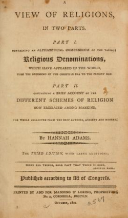 A View of Religions is an 18th-century comprehensive survey of world religions by the American author, Hannah Adams. First published in Boston, Massachusetts in 1784, it was a pioneering work in that it represented denominations from the perspective of their adherents, without imposing Adams' own preferences. The book was divided into sections and passed through several editions, which included minor changes in the name of the work. It was reprinted in England.[1] A View of Religions was Adams' first and principal literary work. It was the result of her dissatisfaction with the prejudice of most writers on the various religious sects. She began thinking on the subject after reading a manuscript from Thomas Broughton's Historical Dictionary of all Religions from the Creation of the World to the Present Times (1742).[2]