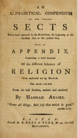 Until she was twenty years of age, Adams's reading had been limited mostly to works of imagination and feeling. She had never been directed to those of a controversial nature, nor to a study of the disputed points between the various sects. Her curiosity being awakened by a small manuscript from Broughton's Dictionary, giving an account of some of the most common of the religious denominations, she began to read all she could find on the subject. At about the age of 30,[3] becoming disgusted with the intolerance and lack of candor of the authors, she decided to write in a blank book what seemed to her to be the truth. In doing this she had no idea of publication. The work grew upon her hands and became known to her friends. Needing money, she was urged to publish it. But to find a printer to take it without immediate pay was the difficulty. She obtained 395 subscribers, 28 of whom were women, including Rev. Nathaniel Emmons, Franklin, Massachusetts (six copies), Rev. Charles Chauncy, D. D., Boston, Dr. James Manning, president of Rhode Island College, Edmund Quincy, Esq., Hon. Oliver Wendell, Nathaniel Appleton, Esq., and Samuel Adams, all of Boston.[4] The hard study and close reflection were so difficult, that she was attacked before she finished it by a severe fit of illness, and threatened with derangement.[3]