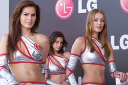 A trade show model (also known as a convention model,[6] trade show hostess,[6] booth companion,[7] or booth professional;[8] a term that has been used only in Japan is companion lady[9] but today more often used is event companion (イベントコンパニオン)) is an assistant that works with a company's sales representatives at a trade show exhibit, working on the floor space or a booth, and representing a company to attendees. Such models are used to draw in attendees and can provide them with basic information about product or services, and may be used to distribute marketing materials or gather customer information for future promotions. Attire and expected interactions vary depend on the nature of the show and on the image the company would like to portray, and they sometimes wear wardrobe that is particular to the company, product, or service represented.