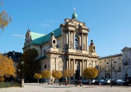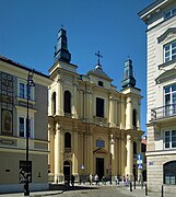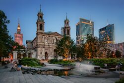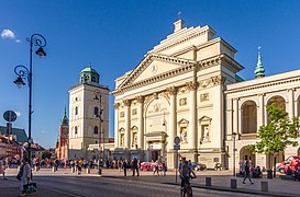 Baroque architecture arrived in Warsaw at the turn of the 16th and 17th centuries with the artists from the court circle of King Sigismund III Vasa (the early Warsaw Baroque is referred to as Vasa Baroque). Among the first structures of the early Baroque, the most important are St. Hyacinth's Church and Sigismund's Column , the first secular monument in the form of a column in modern history.[104] At that time, part of the Royal Castle was rebuilt in this style, the Ujazdów Castle and numerous Baroque palaces on the Vistula escarpment were constructed. In the architecture of Catholic churches, the Counter-Reformation type became a novelty, exemplified by the Church of St. Anthony of Padua, the Carmelite Church and the Holy Cross Church.[105]