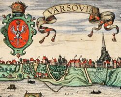 In 1529, Warsaw for the first time became the seat of a General Sejm and held that privilege permanently from 1569.[27] The city's rising importance encouraged the construction of a new set of defenses, including the landmark Barbican. Renowned Italian architects were brought to Warsaw to reshape the Royal Castle, the streets and the marketplace, resulting in the Old Town's early Italianate appearance. In 1573, the city gave its name to the Warsaw Confederation which formally established religious freedom in the Polish–Lithuanian Commonwealth. Due to its central location between the capitals of the Commonwealth's two component parts, Poland and Lithuania, which were Kraków and Vilnius respectively, Warsaw became the capital of the Commonwealth and the Polish Crown when Sigismund III Vasa transferred his royal court in 1596.[27] In the subsequent years the town significantly expanded to the south and westwards. Several private independent districts (jurydyka) were the property of aristocrats and the gentry, which they ruled by their own laws. Between 1655 and 1658 the city was besieged and pillaged by the Swedish, Brandenburgian and Transylvanian forces.[27][32] The conduct of the Great Northern War (1700–1721) also forced Warsaw to pay heavy tributes to the invading armies.[33]