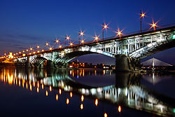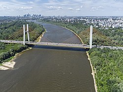 The interwar period (1918–1939) was a time of major development in the city's infrastructure. New modernist housing estates were built in Mokotów to de-clutter the densely populated inner suburbs. In 1921, Warsaw's total area was estimated at only 124.7 km2 with 1 million inhabitants–over 8,000 people/km2 made Warsaw more densely populated than contemporary London.[50] The Średnicowy Bridge was constructed for railway (1921–1931), connecting both parts of the city across the Vistula. Warszawa Główna railway station (1932–1939) was not completed due to the outbreak of the Second World War.