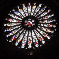 The zodiac is found in medieval stained glass as at Angers Cathedral, where the master glass maker, André Robin, made the ornate rosettes for the North and South transepts after the fire there in 1451.[38]