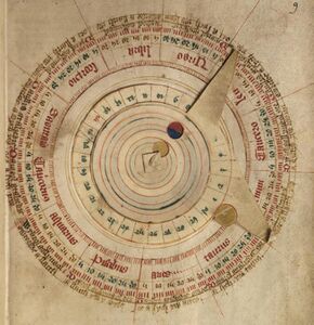 A volvella of the moon. A volvella is a moveable device for working out the position of the Sun and Moon in the zodiac, 15th century