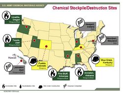 This was to be a full-scale prototype facility using the baseline system. The prototype was a success but there were still many concerns about CONUS operations. To address growing public concern over incineration, Congress, in 1992, directed the Army to evaluate alternative disposal approaches that might be "significantly safer", more cost effective, and which could be completed within the established time frame. The Army was directed to report to Congress on potential alternative technologies by the end of 1993, and to include in that report: "any recommendations that the National Academy of Sciences makes ..."[42] In June 2007, the disposal program achieved the milestone of reaching 45% destruction of the chemical weapon stockpile.[53] The Chemical Materials Agency (CMA) releases regular updates to the public regarding the status of the disposal program.[54] By October 2010, the program had reached 80% destruction status.[55]