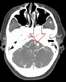 Diagnosis of a ruptured cerebral aneurysm is commonly made by finding signs of subarachnoid hemorrhage on a computed tomography (CT) scan. If the CT scan is negative but a ruptured aneurysm is still suspected based on clinical findings, a lumbar puncture can be performed to detect blood in the cerebrospinal fluid. Computed tomography angiography (CTA) is an alternative to traditional angiography and can be performed without the need for arterial catheterization. This test combines a regular CT scan with a contrast dye injected into a vein. Once the dye is injected into a vein, it travels to the cerebral arteries, and images are created using a CT scan. These images show exactly how blood flows into the brain arteries.[citation needed]