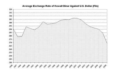 From 18 March 1975 to 4 January 2003, the dinar was pegged to a weighted currency basket. From 5 January 2003 until 20 May 2007, the pegging was switched to United States dollar 1 = KD 0.29963 with margins of ±3.5%.[13] The central rate translates to approximately KD 1 = United States dollar 3.53.