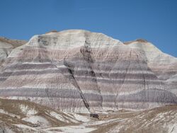 A mountain of clay — Petrified Forest National Park, Arizona. The white bands represent pure bentonite clay.