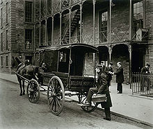 The first known hospital-based ambulance service operated out of Commercial Hospital, Cincinnati, Ohio (now the Cincinnati General) by 1865.[15] This was soon followed by other services, notably the New York service provided out of Bellevue Hospital which started in 1869 with ambulances carrying medical equipment, such as splints, a stomach pump, morphine, and brandy, reflecting contemporary medicine.