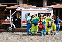 In most places, the EMS can be summoned by members of the public (as well as medical facilities, other emergency services, businesses and authorities) via an emergency telephone number which puts them in contact with a control facility, which will then dispatch a suitable resource for the situation.[8] Ambulances are the primary vehicles for delivering EMS, though some also use cars, motorcycles, aircraft, or boats. EMS agencies may also operate a non-emergency patient transport service, and some have rescue squads to provide technical rescue services.[9]
