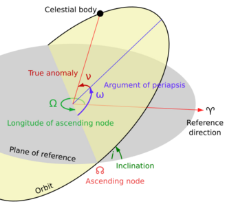 Different sets of elements are used for various astronomical bodies. The eccentricity, e, and either the semi-major axis, a, or the distance of periapsis, q, are used to specify the shape and size of an orbit. The longitude of the ascending node, Ω, the inclination, i, and the argument of periapsis, ω, or the longitude of periapsis, ϖ, specify the orientation of the orbit in its plane. Either the longitude at epoch, L0, the mean anomaly at epoch, M0, or the time of perihelion passage, T0, are used to specify a known point in the orbit. The choices made depend whether the vernal equinox or the node are used as the primary reference. The semi-major axis is known if the mean motion and the gravitational mass are known.[2][3]