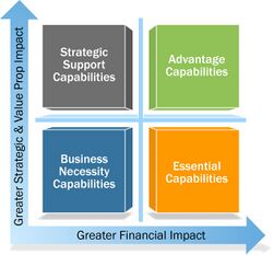 Some capabilities directly contribute to the customer value proposition and have a high impact on company financials. These "advantage capabilities" are shown in the upper right. Value contribution is assured when performance is among the best in peer organizations at acceptable cost. Keep them inside and protect the intellectual property. Moving to the top left quadrant, strategic support capabilities have high contribution in direct support of advantage capabilities. Keep them close. Value contribution is assured when performed above industry parity at competitive cost. Other capabilities shown in the bottom right are essential. They may not be visible to the customer but contribute to company's business focus and have a big impact on the bottom line. Focus on efficiency improvement; especially in high volume work. Value contribution is assured when performed at industry parity performance below competitors' cost. Other capabilities are "business necessity". Value contribution is assured when performed at industry parity performance below competitors' costs. They can be candidates for alternate sourcing.