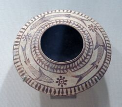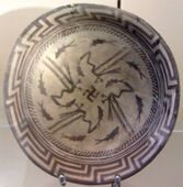 Samarra plate, with a design consists of a rim, a circle of eight fish, and four fish swimming towards the center being caught by four birds, at the center being a swastika symbol; circa 4000 BCE; painted ceramic; diameter: 27.7 cm; Vorderasiatisches Museum (Berlin)