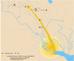 In North Mesopotamia, Ubaid culture expanded during the period between about 5300 and 4300 BCE.[16] It is preceded by the Halaf period and the Halaf-Ubaid Transitional period and succeeded by the Late Chalcolithic period. The new period is named Northern Ubaid to distinguish it from the proper Ubaid in southern Mesopotamia.[17]