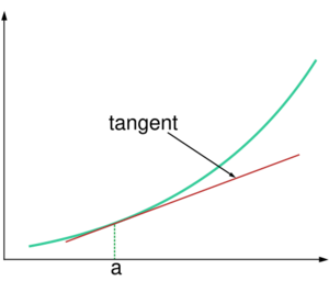 This is a good approximation when [math]\displaystyle{ x }[/math] is close enough to [math]\displaystyle{ a }[/math]; since a curve, when closely observed, will begin to resemble a straight line. Therefore, the expression on the right-hand side is just the equation for the tangent line to the graph of [math]\displaystyle{ f }[/math] at [math]\displaystyle{ (a,f(a)) }[/math]. For this reason, this process is also called the tangent line approximation. Linear approximations in this case are further improved when the second derivative of a, [math]\displaystyle{ f''(a) }[/math], is sufficiently small (close to zero) (i.e., at or near an inflection point).