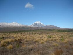 The tallest mountain, Ruapehu, is an andesite cone that was somewhat higher but has been eroded with a 150 km3 (36 cu mi) cone and 150 km3 (36 cu mi) ring-plain.[2] It is typical of the Tongariro Volcanic Centre whose landforms are defined by the intermediate properties of its andesite magma, having a moderate amount of silica, making it more viscous than basalt, but much less viscous than rhyolite. Andesite magma in effusive eruptions cools to form dark grey lava if gas-poor or scoria if gas-rich. The explosive eruptions tend to be small or moderate sized phreatomagmatic eruptions where the hot magma turns water into steam and the magma into ash. Northwest of Ruapehu is Hauhungatahi the oldest recorded volcano in the south of the plateau.[2] The other two most prominent volcanic mountains are Tongariro and Ngāuruhoe part of a single composite stratovolcano, like Ruapehu made up of layers of lava and tephra.