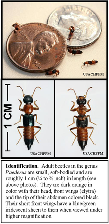 ↑Frank JS (2008). "Dermatitis linearis". In Capinera JL (ed.). Encyclopedia of entomology. Springer. pp. 1179–. ISBN978-1-4020-6242-1. Archived from the original on 17 March 2022. Retrieved 30 January 2021. The 28 species thus far shown to produce such a toxin belong to three of the 14 genera of Paederina, namely Paederus, Paederidus, and Megalopaederus