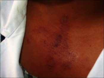 Once pederin is on the skin from the initial beetle contact, it may also be spread elsewhere on the skin. "Kissing" or "mirror-image" lesions where two skin areas come in contact (for example, the elbow flexure) are often seen.[6] Washing the hands and skin with soap and water is strongly recommended, if contact with a rove beetle has occurred.[8]